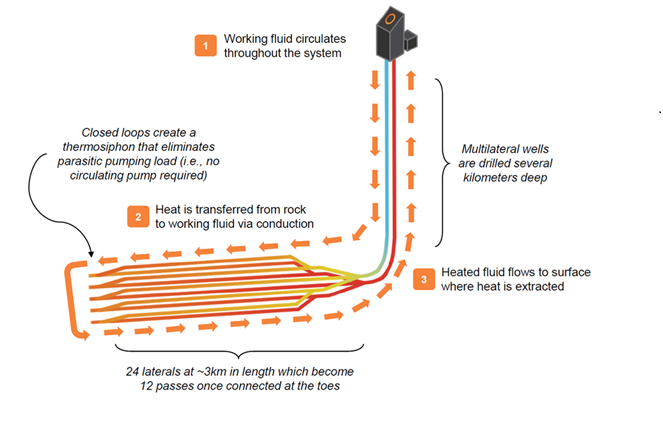 An Eavor-Loop consists of two sets of multi-lateral wellbores, positioned within 60 to 80 m vertically in a competent formation, as depicted in the conceptual schematic, Fig. 1. The main wellbores are drilled from a common surface location, and the laterals are connected toe-to-toe underground, essentially forming a massive subsurface radiator.