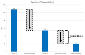 - Overall drilling time: Reduced from over 100 days, each, for the first four lateral pairs to approximately 50 days for the final two.