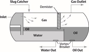 Three-phase separators are very common at many well sites, Fig. 1. The vessel is a simple device consisting of a series of baffles and weirs that separate the mixed phase feed stream into gas, oil and water, so it can be efficiently transported to downstream operations for further processing. The liquid/vapor mixture from the wells enters the left side of the vessel, where liquids quickly disengage and fall to the bottom. The gas vapors exit via overhead piping, and the liquids separate, with the oil floating on top of the water.